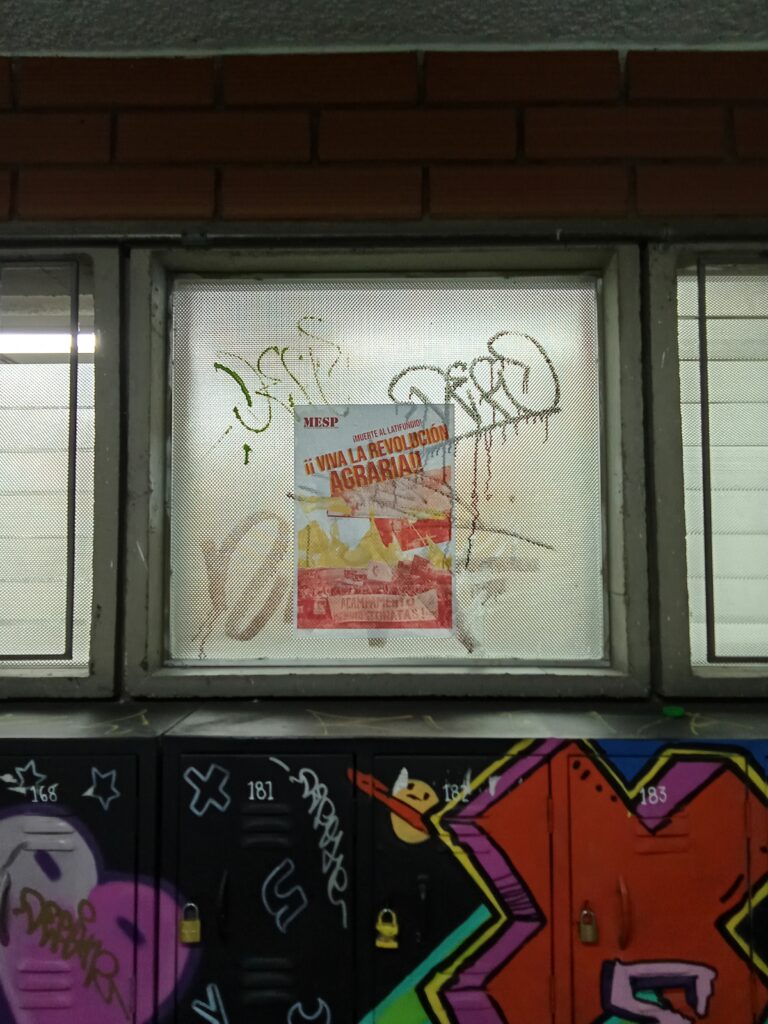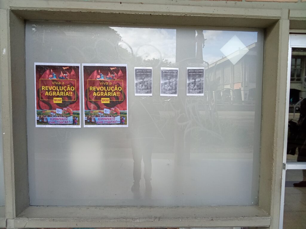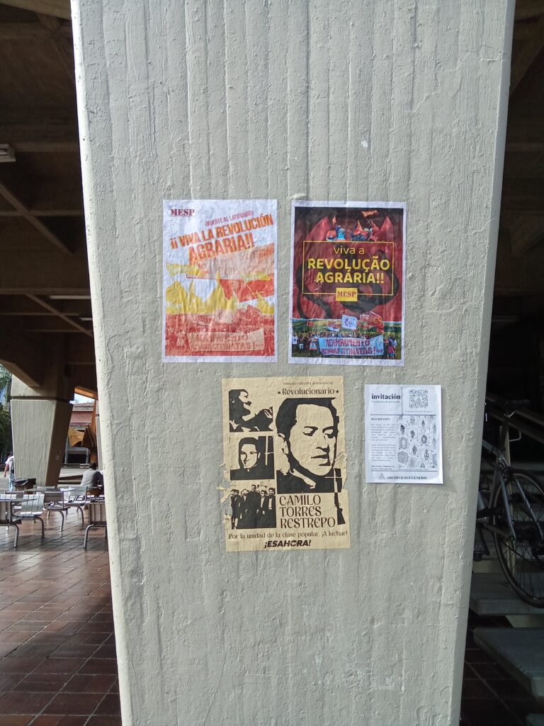 El Movimiento de Estudiantes al Servicio del Pueblo (MESP) junto a activistas y estudiantes democráticos realizaron un conversatorio sobre la lucha por la tierra que están desenvolviendo los campesinos pobres en Brasil, además pegaron algunos carteles con la frase “ Viva la Revolución Agraria” en la Universidad de Antioquia. En el conversatorio se mostraron noticias que mostraban la represión y guerra que lleva a cabo el latifundio en Brasil contra el campesinado, así como noticias que mostraban la organización, combatividad y lucha que desarrollan los campesinos pobres. Se enfatizó en la actuación de la Liga de Campesinos Pobres (LCP) y en la Batalla Feroz de Barro Branco que se dio en septiembre de 2024 donde la resistencia de los campesinos y campesinas junto con estudiantes revolucionarios expulsaron a los pistoleros (paramilitares) que pretendían desalojarlos de sus tierras.