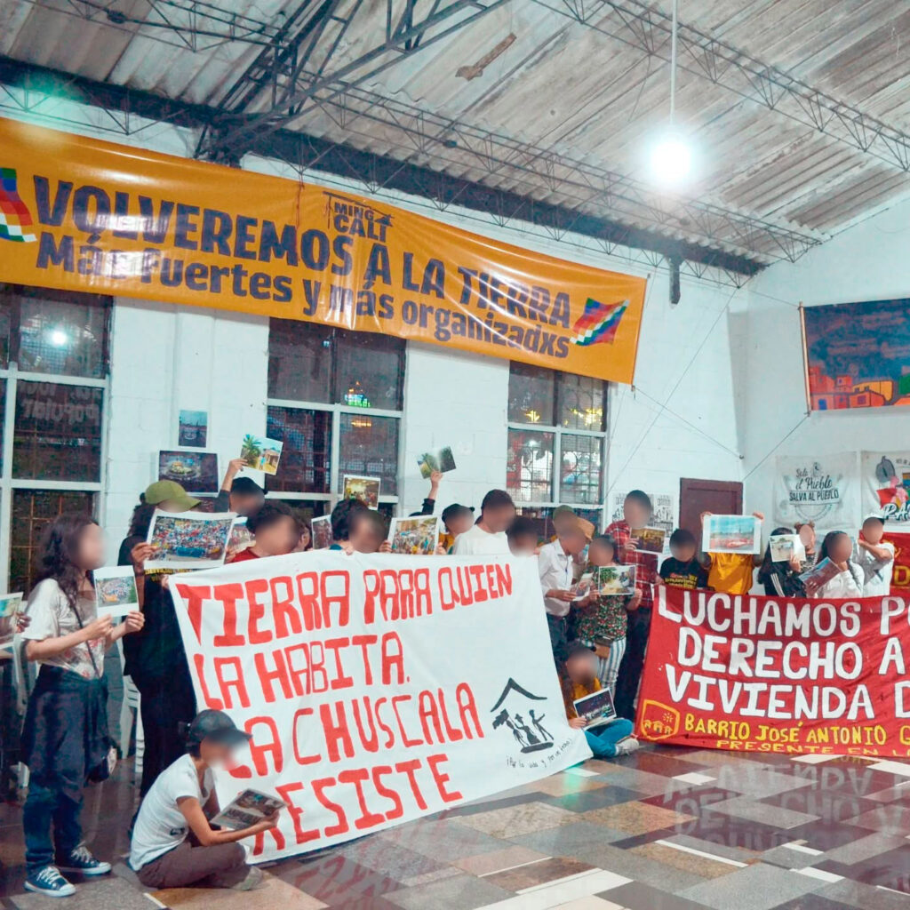 “Minga Cali es una juntanza de más de 20 organizaciones sociales, defensores de derechos humanos, colectivos, fundaciones, consejos comunitarios. Venimos dando la lucha por acceso a tierra en la ciudad de Cali. […] Muchos llegamos a Cali porque fuimos desplazados de nuestras tierras. Llegamos a Cali y allí hemos sufrido desalojos. La tierra ha estado en manos de las élites económicas… nosotros los de a pie debemos juntarnos, unir fuerzas para esa lucha a ver si nos dan derecho a tener un pedacito de tierra, territorio, para tener una vivienda digna. […] El acceso a la vivienda es un privilegio. Las tierras disponibles para vivienda, se las entrega el Estado a las constructoras. Es el modelo de ciudad y progreso de los ricos.”