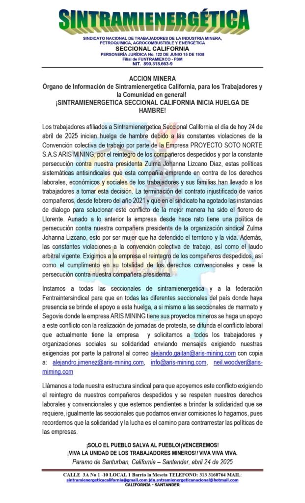 El pasado 24 de abril, los trabajadores afiliados a Sintramienergética Seccional California inician huelga de hambre, en un comunicado el sindicato dice que la huelga se da «debido a las constantes violaciones de la Convención colectiva de trabajo por parte de la Empresa PROYECTO SOTO NORTE S.A.S ARIS MINING, por el reintegro de los compañeros despedidos y por la constante persecución contra nuestra presidenta Zulma Johanna Lizcano Diaz».