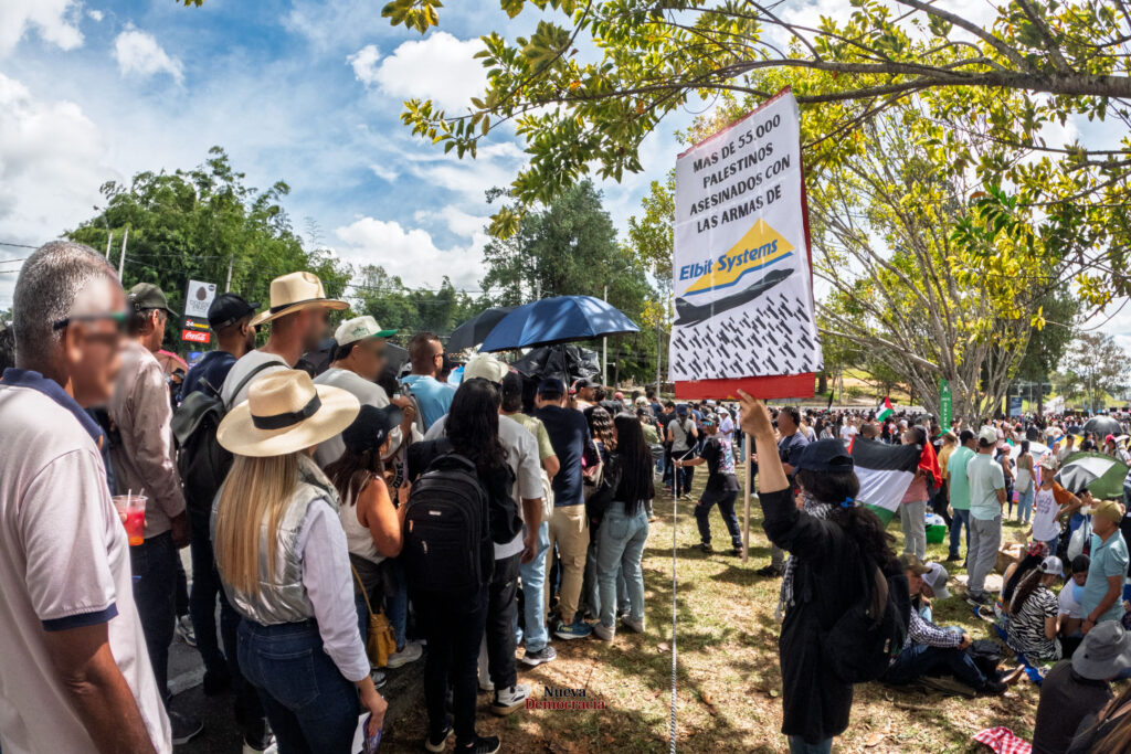 Los activistas y revolucionarios estaban rechazando la presencia de dos empresas militares israelíes, Elbit Systems e Israel Aerospace por vender armas y tecnología que se usan para vigilar la Franja de Gaza y luego bombardearla, es decir, son empresas que participan directamente del genocidio contra el pueblo palestino. Las fuerzas armadas en Colombia han usado esta tecnología para reprimir las diferentes luchas del pueblo en nuestro país.