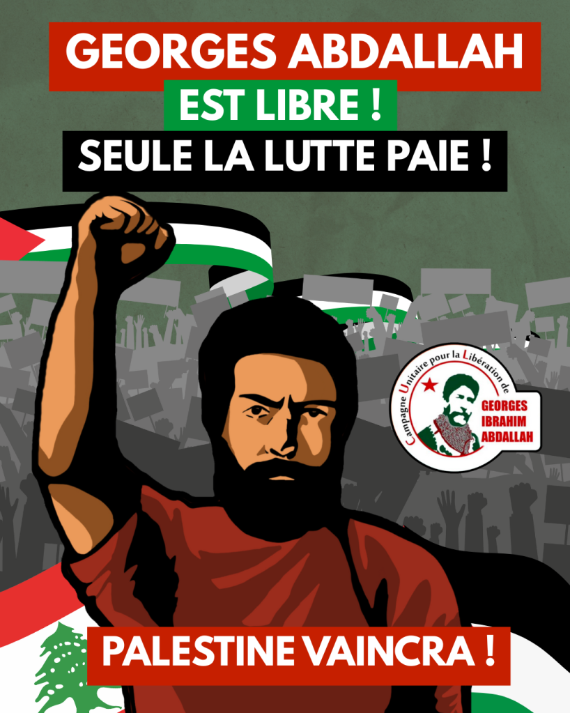 Georges Abdallah siempre ha proclamado y demostrado que otro futuro es posible e inevitable; su liberación hoy es también una demostración flagrante de ello que sólo puede alentarnos a continuar la lucha por Palestina, por toda Palestina y más ampliamente por la emancipación de los pueblos y naciones oprimidos por la victoria o la victoria.