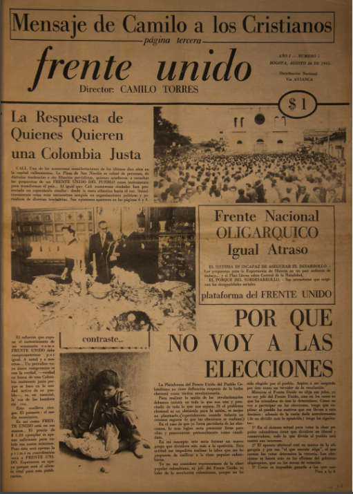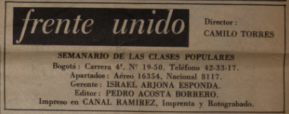 El cura revolucionario Camilo Torres, al fundar el periódico Frente Unido, lo concibió como una herramienta para la organización y la unidad de los diferentes sectores del pueblo dispuestos a realizar la revolución en Colombia. En su mensaje al Frente Unido, Camilo plantea la importancia política de la unidad popular: “De ahí nuestra insistencia en la unidad de los revolucionarios. Porque sabemos que las etapas que se avecinan serán infinitamente más difíciles que las que hasta ahora nos ha tocado vivir, y que, si no luchamos todos unidos, corremos serio riesgo que el dolor causado al pueblo sea mucho mayor, con menos provecho para la causa revolucionaria. Y de ello seríamos responsables los revolucionarios que no hemos sido capaces de poner los intereses del pueblo por encima de nuestras propias disputas.”