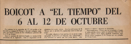 El periódico Frente Unido planteaba que la confrontación directa con el monopolio de la prensa era necesaria, razón por la cual, hizo un llamado al boicot contra el diario El Tiempo, vocero de la oligarquía. El Frente Unido propuso: “Por petición de los comandos del FU del pueblo se ha decidido no comprar El Tiempo y destruir cualquier ejemplar que llegue a manos de los colombianos patriotas”; el motivo: “la ausencia de sanciones legales en contra de los periódicos de la oligarquía, la impunidad de las calumnias de la gran prensa, la indiferencia de El Tiempo por su pérdida de popularidad ante la clase popular”.