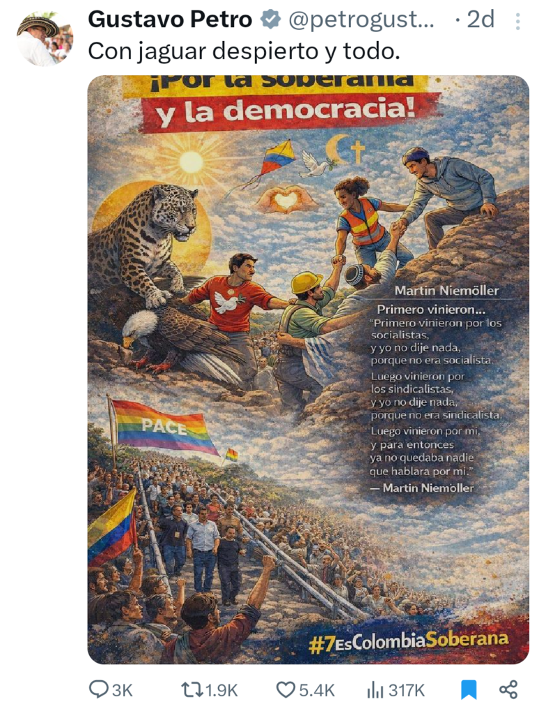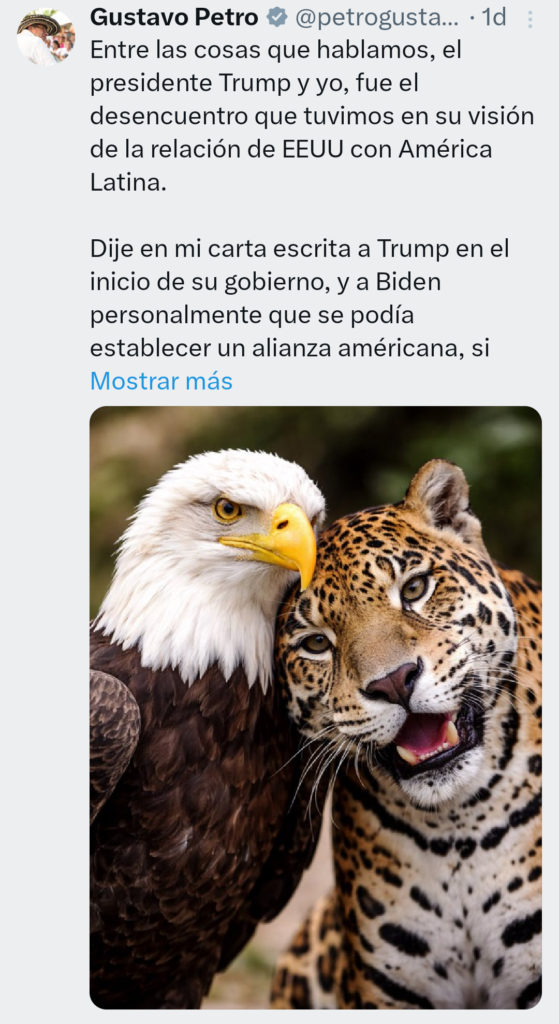 Rápidamente han surgido respuestas y comentarios a estas polémicas declaraciones de Petro y sus funcionarios. En redes sociales se han difundido dos publicaciones de Petro en la red social X donde se evidencia el contraste en sus posiciones. Primero publica un post en donde se ve, entre otras cosas, un Jaguar pisoteando a un águila, siendo el jaguar la representación de Colombia y el águila la representación del imperialismo yanqui. Y después de la llamada con Trump, Petro publica un post con la imagen de un jaguar y un águila de una forma más amigable, como en una especie de abrazo en señal de “unidad y reconciliación”, algo imposible entre una nación oprimida como Colombia y una superpotencia imperialista como Estados Unidos.