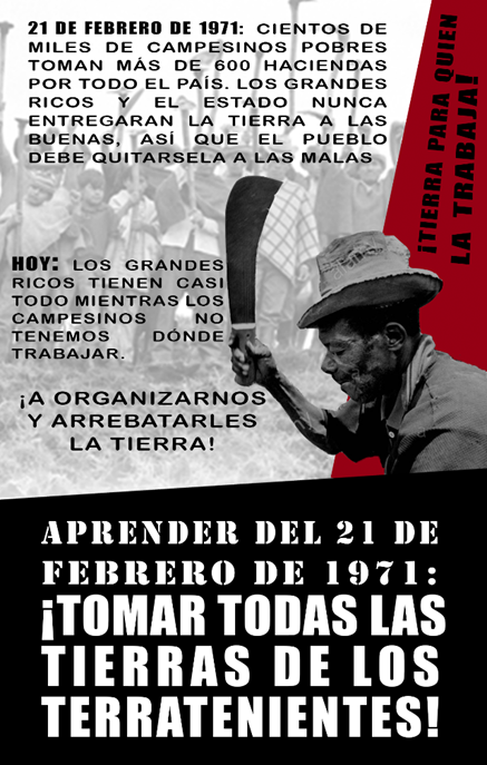 Estos problemas estructurales, la dominación imperialista y la concentración de la tierra, están estrechamente relacionados. No es casualidad que la ANUC llamara a la unidad del pueblo contra el imperialismo. Por la lucha contra los terratenientes, pero también por la lucha contra el imperialismo que se expresó aquel 21 de febrero con las cientos de tomas de tierras alrededor del país, es que celebramos este día como el día de la lucha campesina.
