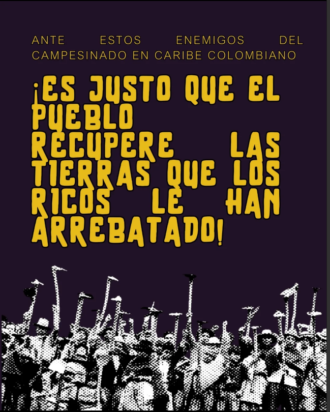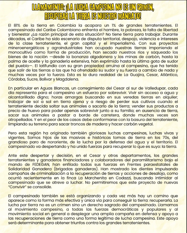 ¡Solidaridad con la Integración Campesina del Cesar que lucha por recuperar la tierra robada por siglos de latifundio y servilismo al extranjero!
